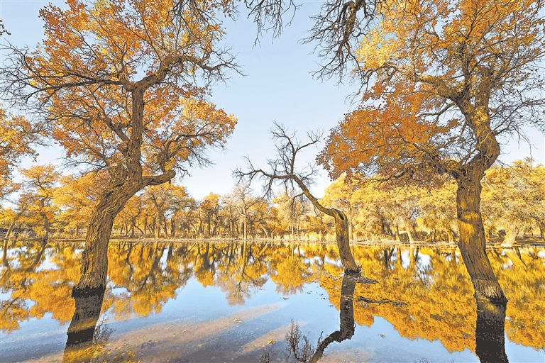这是10月27日在额济纳旗大漠胡杨林景区拍摄的胡杨。金秋时节,内蒙古额济纳旗的胡杨林美景如画。新华社发
