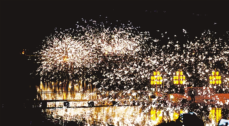 夜幕下,在西夏风情园蝶湖西侧,金黄色的“火龙”上下翻飞,非遗技艺“打铁花”引来阵阵惊叹,“啪!”一串巨响,闪烁的“铁花”如瀑布般从夜空中倾泻而下,如同金丝构成的花雨,又像流星飞泻,前来观赏的市民游客一边惊叹,一边用手机或相机记录这美妙瞬间。