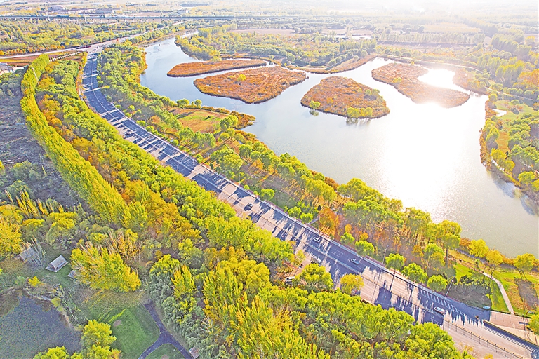 10月28日,银川市西南一隅,金黄的行道树随着蜿蜒的亲水大街延伸,斜阳下的典农河风光旖旎,一幅生态画卷徐徐展开。