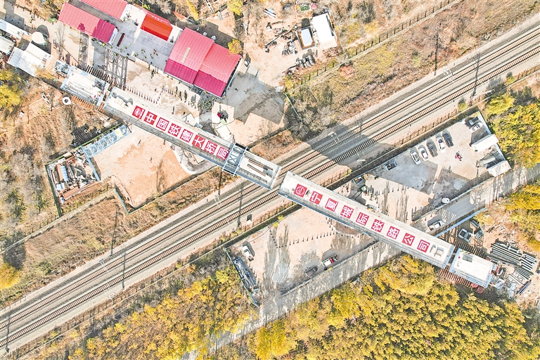 10月29日上午,经过紧张作业,重达1700吨,总长136米的中国铁建大桥局建设的上跨包兰铁路特大桥双幅梁体分别旋转53度、55度,精准上跨包兰、定银铁路,为随后的银巴铁路宁夏段架梁施工创造有利条件。银川至巴彦浩特铁路项目建成后,对推动区域经济社会发展具有重要意义。 本报记者 赵磊 摄