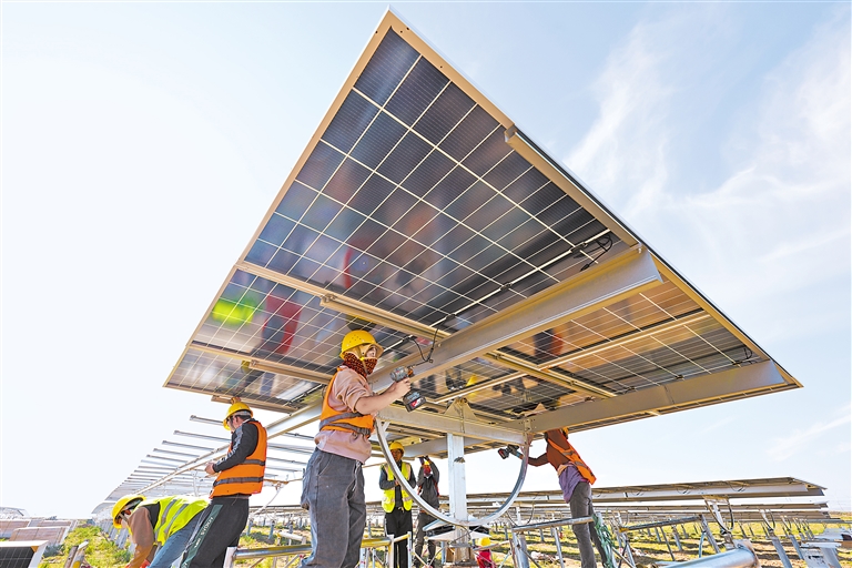 10月28日,灵武市马家滩镇的“沙戈荒”光伏基地建设正酣,工人在安装光伏板。近年来,宁夏在沙漠、戈壁、荒漠地区建设大型风电光伏能源基地,依托银东、灵绍两大直流外送通道,将绿电外送,不断推动能源清洁低碳转型发展。 本报通讯员 袁宏彦 摄
