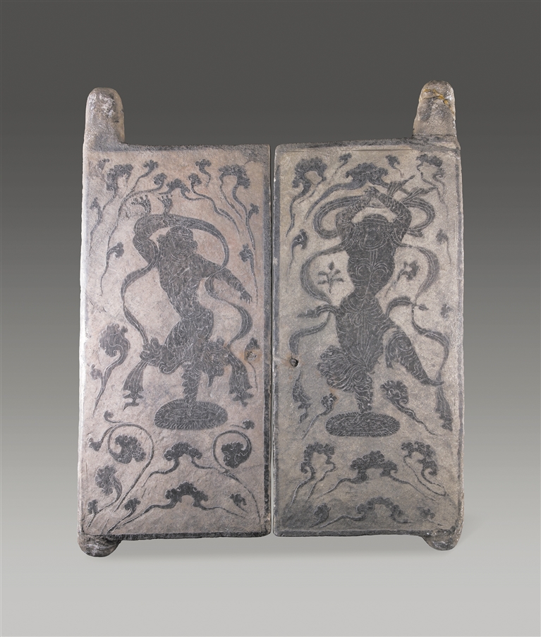 跟随李东海的描述细细端详眼前的墓门,记者似乎也走进了胡旋舞的世界。眼前,左边的小伙子又一个经典的旋转,侧身回首,左腿稳稳地站在圆毯上,右腿优雅地后屈,左手轻扬,右臂则弯曲至头顶,仿佛在向无尽的时空致敬。而右侧的小伙子则以另一种姿态对立,右腿立在毯上,左腿向前伸展,双臂高举在头顶上方合拢,像是在向着未来展翅飞翔。随着他们的舞动,手中的长巾在空中挥旋,飘逸而潇洒。周围浅雕的卷云纹流动起来,两位舞者如同在云间起舞,豪放不羁。