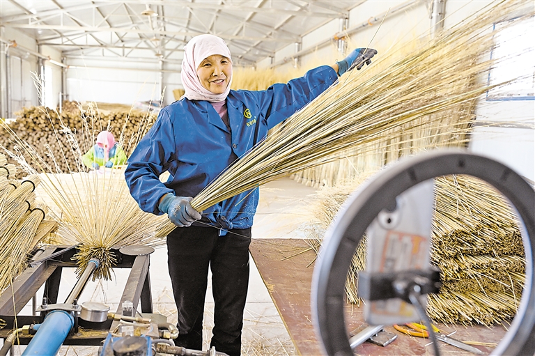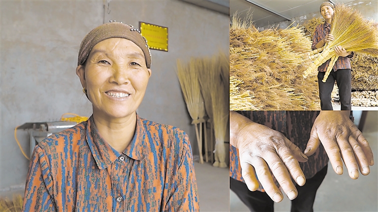 2024年5月,李耀梅在扶贫车间里和工人一起用自己研制的机械化设备扎扫帚,并开启网络直播拓展销路。