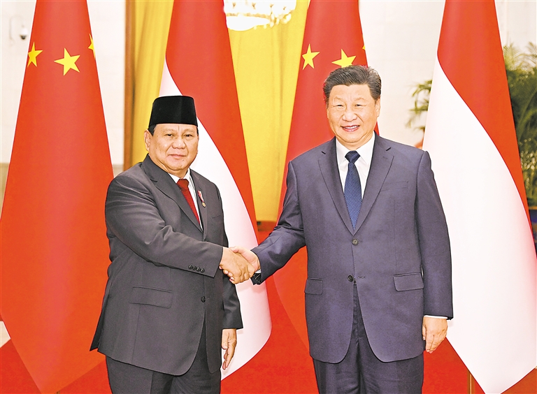 普拉博沃表示,中国是伟大的国家,印尼和中国拥有千年友好交往史,两国关系保持良好发展势头。在当前复杂国际形势下,印尼希望进一步强化同中国全方位战略协作,成为更加紧密的全面战略伙伴,构建具有地区和全球影响力的命运共同体,这将不仅造福两国人民,也为亚洲地区更好实现和平发展营造良好环境。印尼愿同中方继续高质量共建“一带一路”,完善“五大支柱”合作格局,加强基础设施、能矿、医药、农业、住房、海上共同开发、粮食安全、减贫等全方位全产业链合作,欢迎中国企业赴印尼投资。印尼完全支持中国政府在台湾问题上的立场,坚定奉行一个中国政策,坚定支持中国政府为捍卫领土完整、实现国家统一所作努力。涉疆事务完全是中国内政,印尼坚持不干涉内政原则,坚定支持中方为维护新疆发展稳定所作努力。感谢中方在巴勒斯坦问题上主持公道正义。印尼坚持独立自主,坚持不结盟外交政策,不加入任何针对第三方的军事同盟或“小圈子”,支持习近平主席提出的三大全球倡议,愿同中方密切在二十国集团等多边框架内沟通协作,为维护全球南方共同利益、促进世界多极化、推动构建人类命运共同体作出积极努力。