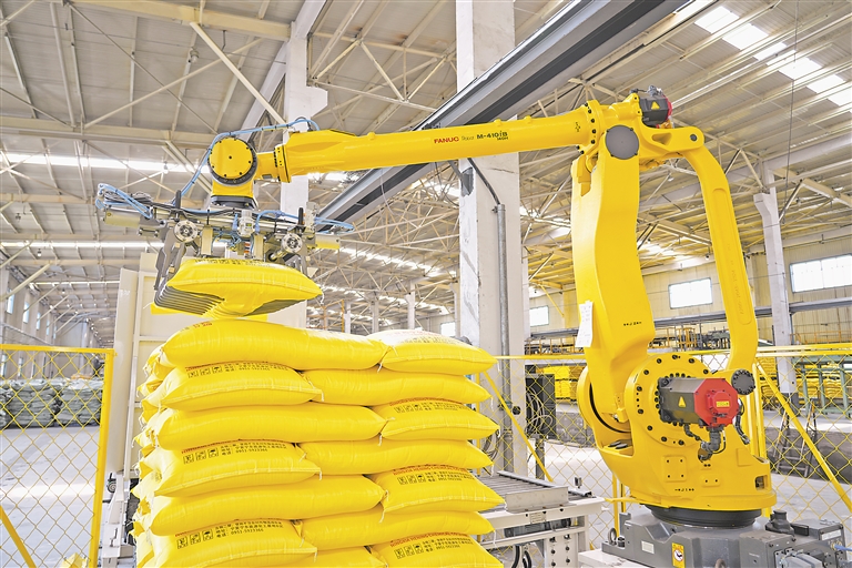走进储运车间,数字化车间改造成效初显。尿素打包过程完全自动化、智能化:机器自动抓取包装袋并张开袋口,50公斤尿素颗粒从料斗进入袋中后,自动封口。封好口的尿素袋通过输送带送至运输区,码垛机的一台机械手臂不到4分钟就能将50袋尿素整齐地码放在托盘上,准备装车。