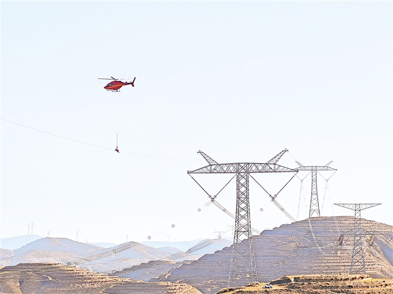 11月8日,国网宁夏电力有限公司超高压公司利用直升机绞车吊椅法顺利完成±1100千伏吉泉线地线接头补强,保障了“西电东送”大动脉安全稳定供电。 本报记者 鲁延宏 摄
