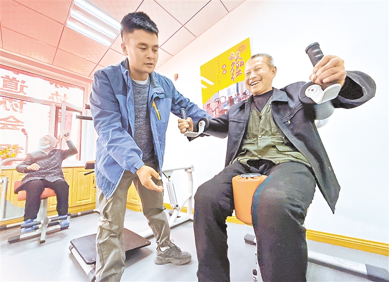 11月8日,丽景街双庄社区运动健康中心,工作人员正在为居民指导健身动作。当日上午,银川市兴庆区丽景街街道双庄社区运动健康中心正式营业,运动健康中心占地面积500平方米,分上下两层,是以社区为载体,以中青年和老年人为主体,以智能化为手段,促进全民健身及健康为目的新型社区运动健康中心。 本报记者 马楠 摄