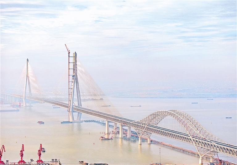 这是11月10日拍摄的建设中的常泰长江大桥(无人机照片)。11月9日,经过近三个月的紧张施工,常泰长江大桥上下层钢桥面主体铺装全部完成。这是这座世界最大跨度斜拉桥全线贯通后,工程建设取得的又一次重大进展。常泰长江大桥连接江苏省常州、泰州两市,是长江上首座集高速公路、城际铁路、普通公路三种方式于一体的过江通道。据了解,常泰长江大桥预计2025年上半年基本建成。新华社发