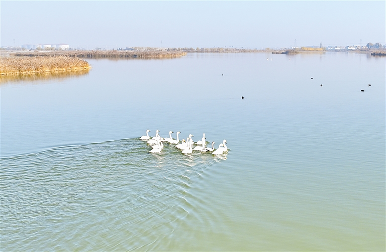 近日,一群小天鹅在银川市西夏区犀牛湖湖面上游弋。近年来,西夏区高度重视生态保护工作,通过实施一系列生态治理和保护措施,有效改善了湖泊水质,为候鸟迁徙营造良好的生态环境。