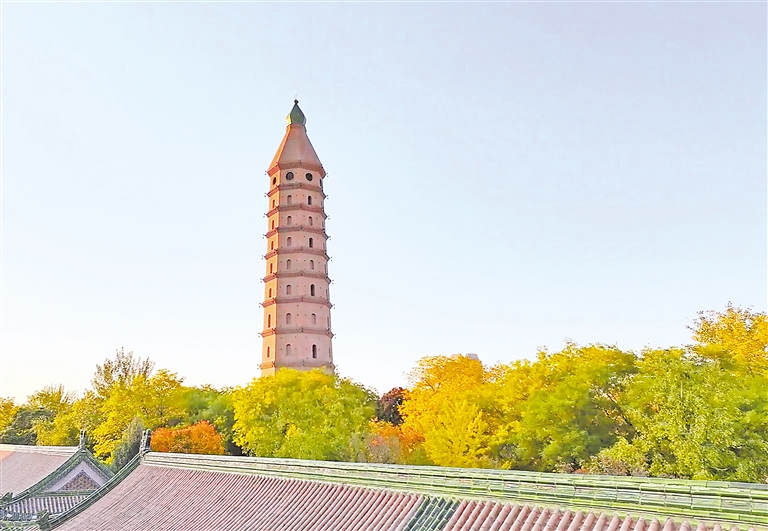 步入进宁南街,宛若进入铺展开来的一幅历史画卷,抬眼远眺承天寺塔,韵味十足。承天寺塔为11层楼阁式砖塔,平面呈八角形,各层檐角石榴状的铁柄上挂有铁铃,微风吹过,铃声悠扬。
