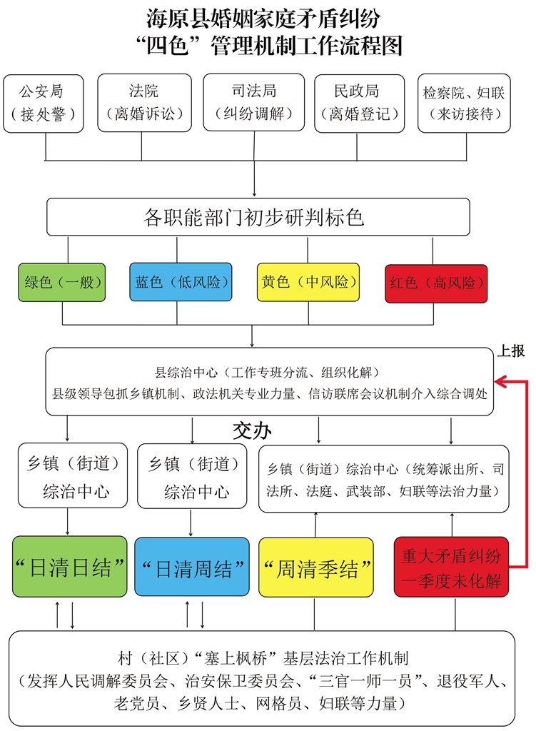 自今年8月建立和运行红、黄、蓝、绿“四色”分类分级预警处置机制以来,该县共研判分流推送婚姻家庭矛盾纠纷936件,其中红色高风险矛盾纠纷4件、黄色中风险矛盾纠纷22件、蓝色低风险矛盾纠纷87件。通过强化机制运行,压实属地、行业责任,打破各部门间信息壁垒,扭转了排查化解单打独斗的局面,实现了婚姻家庭矛盾纠纷联调联控良性循环。