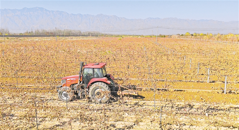 11月13日,在志辉源石酒庄,葡萄埋藤机往来穿梭实施全程机械埋置,为葡萄树穿上“防寒衣”。下架埋藤,是贺兰山东麓葡萄酒产区独特的风土习俗,随着气温逐渐降低,银川市西夏区4.6万亩葡萄树进入冬埋期。 宁夏日报报业集团全媒体记者 张雪梅 见习记者 弥楠 摄