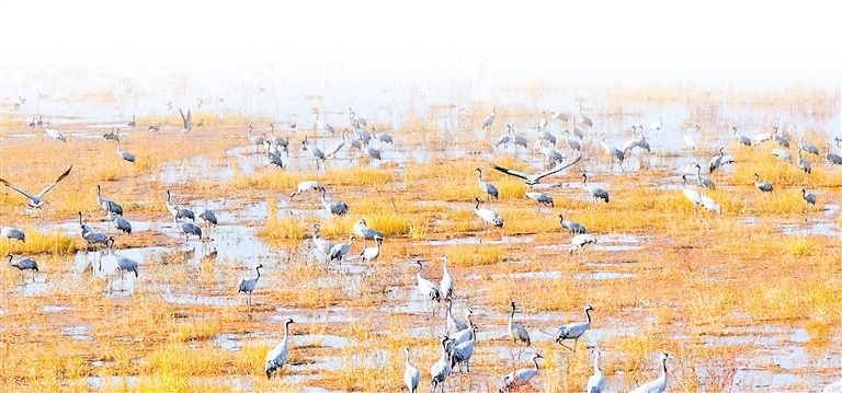 石嘴山市地处我国三大候鸟迁徙线的东亚—澳大利亚和中亚两条迁徙线上,是重要的候鸟集群停歇地和迁徙中转站。近年来,该市以“一河一山两湖”为重点,全面推进重点生态功能区、重点生态系统、重点生态廊道、重点河湖滩地保护修复,以银河湾、天河湾为主的黄河湿地以及星海湖、简泉湖等野生动物栖息地面积及生态环境质量稳步提升,迁徙留居石嘴山市的候鸟种群数量不断增加。每年10月到次年4月,占全球总量四分之一的6000多只灰鹤不远万里长途跋涉,相聚黄河湿地栖息越冬。