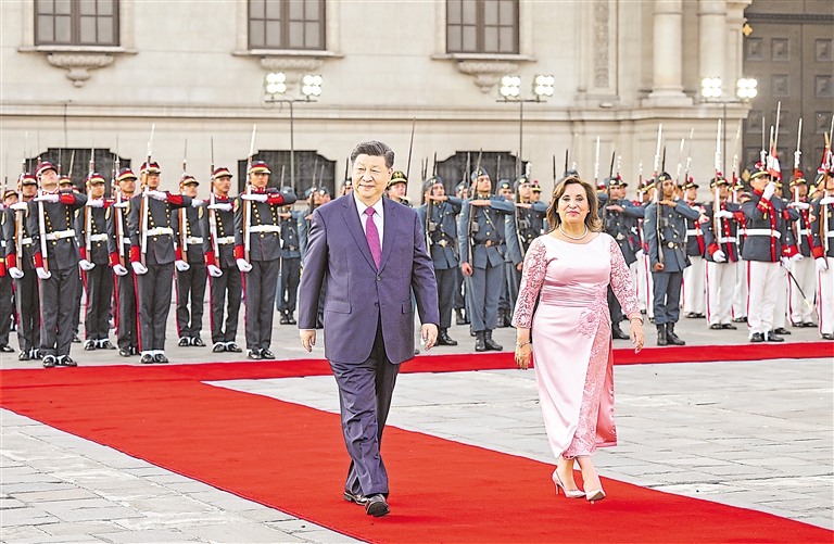习近平指出,这是我第三次访问秘鲁,也是一年时间里第三次同总统女士会晤。许多秘鲁民众自发聚集道路两旁,挥手致意表示欢迎,让我深切感受到秘鲁人民对中国人民的友好情谊。中秘同为文明古国。古老文明的深厚积淀,赋予中秘两国智慧和胸怀,让我们能够看清历史前进方向,顺应时代发展潮流,始终坚持平等相待、互尊互信、互学互鉴,成为不同体量、不同制度、不同文化国家团结合作的典范。建交53年来,特别是我2016年对秘鲁进行首次国事访问以来,在双方共同努力下,中秘贸易投资合作快速增长,为两国人民带来实实在在的利益。双方要总结经验,推动两国务实合作提质升级,使中秘全面战略伙伴关系不断迈上新台阶,更好造福两国人民。