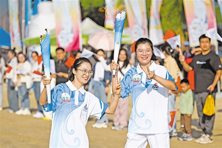 11月17日,火炬手韩晓燕与容飞(右)在火炬传递中。当日,第十二届全国少数民族传统体育运动会火炬实地传递活动在海南三亚举行。 新华社发