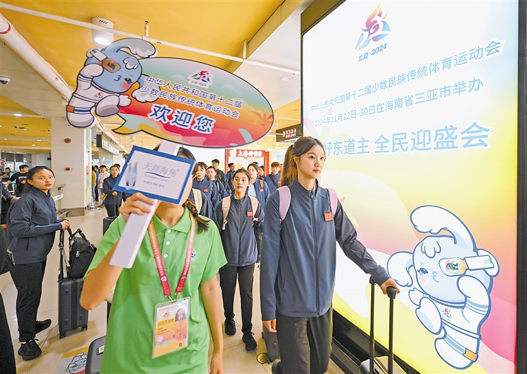 11月18日,天津代表团成员抵达海南三亚。当日,参加第十二届全国少数民族传统体育运动会的多个代表团抵达海南三亚。新华社发