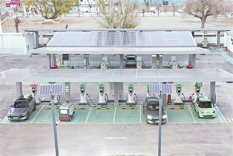 近日,新能源车在宁夏银川市兴庆区的银川南智慧充电服务示范中心有序充电。该中心是西北首个集风、光、储、充、放及客户服务于一体的综合性智慧充电示范中心,充分利用风电、光伏、储能等清洁、低碳、高效的充电站能源供应体系,实现能源互补和稳定供应,配备了27台直流充电桩、2台共享直流充电桩和1台储能充电桩,能同时满足49辆新能源车充电,预计年充电量可达500万千瓦时,年减少碳排量超过4000吨。