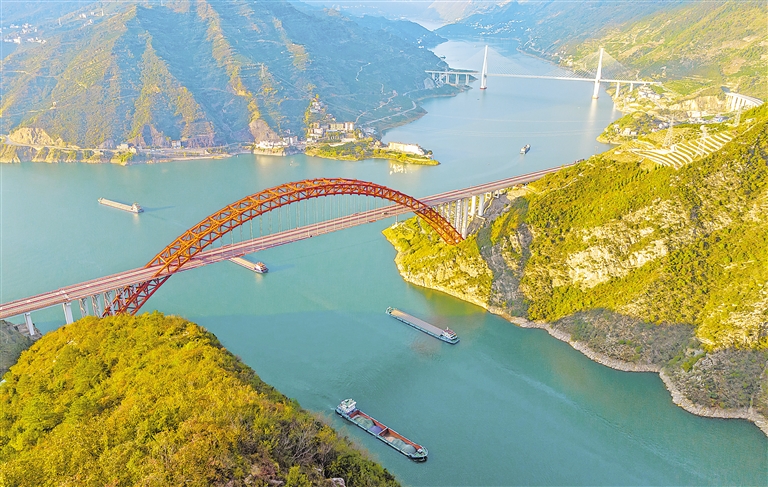 11月20日,船舶行驶在长江三峡西陵峡湖北省宜昌市秭归县水域(无人机照片)。初冬时节,长江三峡西陵峡两岸色彩斑斓,好似一幅美丽画卷。新华社发