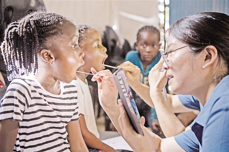 11月20日,在纳米比亚首都温得和克附近的弗兰斯艺术培训中心,中国医生给孩子们进行口腔健康检查。