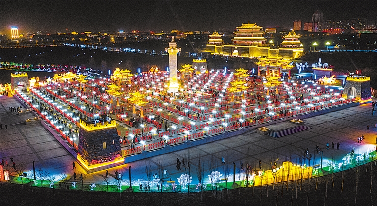 夜晚的九曲民俗文化园流光溢彩,宛如镶嵌在盐池县城的一颗璀璨明珠。九曲民俗文化园把古老的黄河文明、浓郁的丝路风情、悠久的边塞文化、独特的民俗风情凝聚、幻化为绚丽的彩虹,展现在宁夏的“东大门”,成为盐池县的亮丽名片。