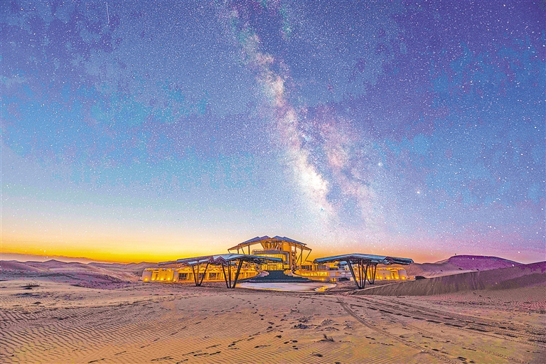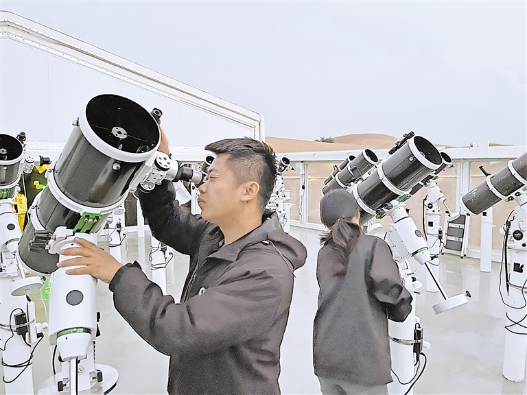 中卫市腾格里沙漠腹地有一处“秘境”——沙漠星星酒店。每当夜幕低垂,酒店绚丽的灯光在浩瀚的沙漠中亮起,其独特的星星造型在夜色中熠熠生辉,与天空中闪烁的星光交相辉映。此时,“00后”观星师张佳瑶便开始忙碌起来。“请大家顺着我指的方向看,那个像反写的‘人’字形状的便是著名的北天星座之一——英仙座,它的流星雨几乎没有在夏季星空中缺席过,居全年三大周期性流星雨之首。”张佳瑶一边讲解一边用手中的激光笔在夜空中比画。