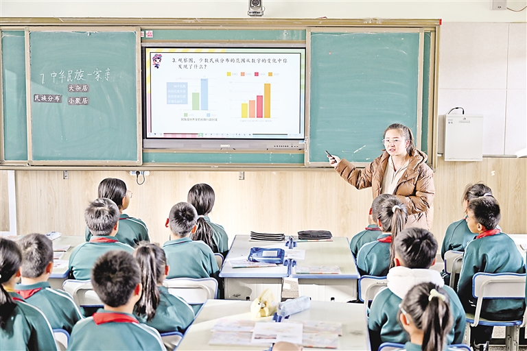 11月21日,银川市兴庆区实验第二小学教育集团臻园分校学生正聚精会神地上《中华民族一家亲》思政课。该校致力于将“铸牢中华民族共同体意识”融入教育各个方面,创新性地开设了一系列旨在培育学生中华民族共同体意识的课程和活动,将民族团结进步理念自然融入学生的学习和生活中。 本报记者 王鼎 摄