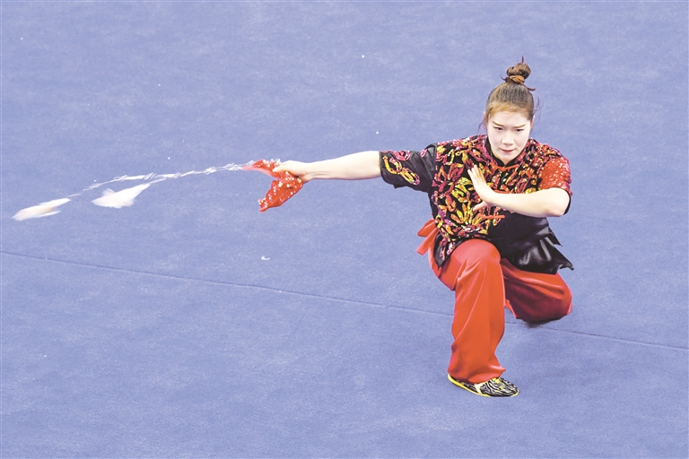 当日下午,女子软器械项目比赛拉开帷幕。各代表团选手展现了自己的“独门兵器”。除了刀、枪、剑等大家熟悉的器械外,比赛现场也出现了一些如双鞭、流星锤等极具民族特色的器械。