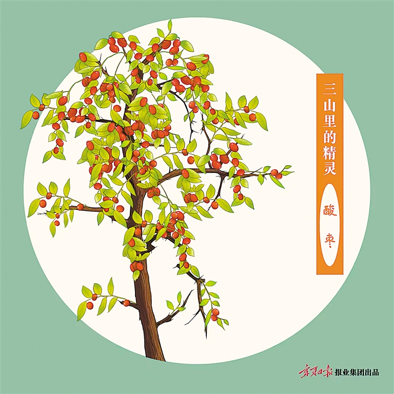 根系发达,在荒山、丘陵、河滩,光秃秃的岩石上也能生长。酸枣树耐旱、耐涝、耐瘠薄,能够绿化荒山,保持水土。手绘:李雪