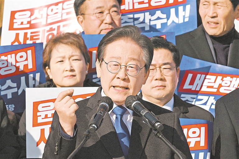12月4日,在韩国首尔,韩国最大在野党共同民主党党首李在明在反对韩国总统尹锡悦的集会上发表讲话。