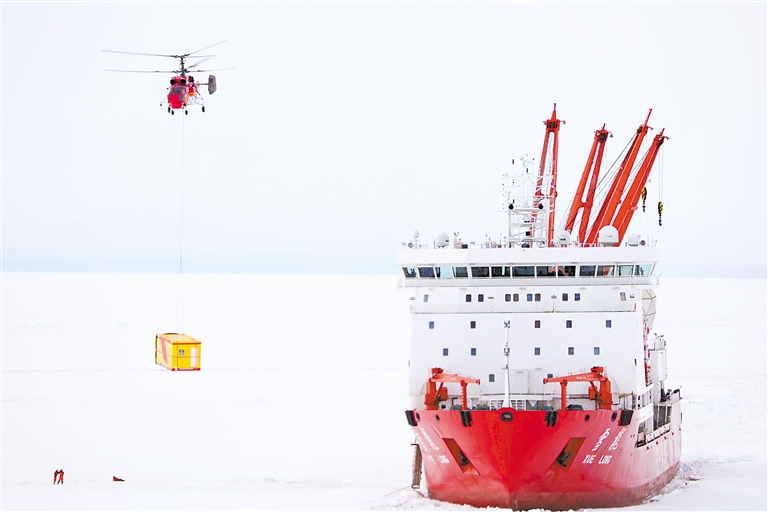 直升机将“雪龙”号上的货物运送至中山站(12月7日摄)。日前,执行中国第41次南极考察任务的“雪龙”号和“雪龙2”号开始南极中山站区域卸货作业。