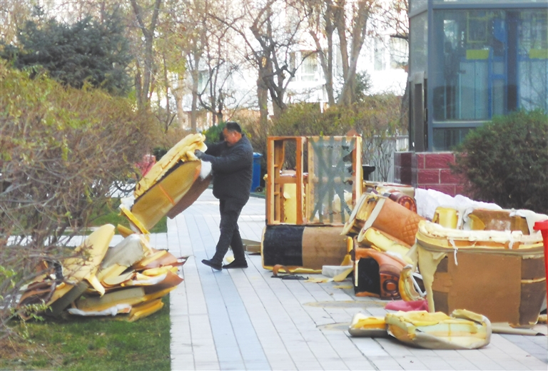 12月7日,记者在银川市金凤区一小区看到,有居民正在楼下拆分废旧家具。有群众反映,对于家庭“断舍离”的废弃大件垃圾,小区不准乱投乱放、废品站不收、环卫车拉不了, 如何处理,成了“头疼事”。本报记者 杨超 摄
