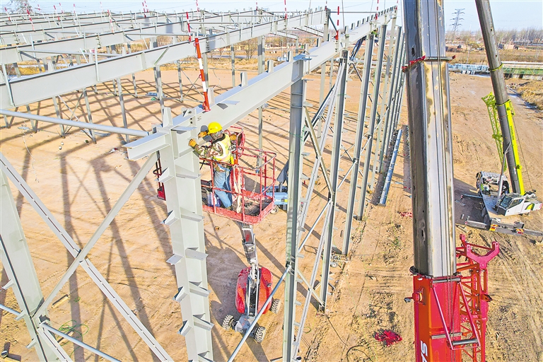12月13日,宁夏沃滴滴水肥科技有限公司年产100万吨水肥一体化项目建设现场,大型工程机械与工人相互配合安装钢结构厂房。该项目位于贺兰工业园区暖泉片区,占地320.17亩,计划投资35.6亿元,年度投资4亿元,建设周期24个月。项目建成后,满产年销售收入可达81亿元,增加350个就业岗位。 本报记者 马楠 王洋 摄