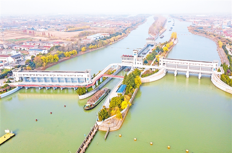 12月13日拍摄的位于江苏省扬州市江都区的南水北调东线一期工程运盐闸、邵仙套闸、邵仙闸洞(无人机照片)。2024年12月12日,南水北调东中线一期工程迎来全面通水10周年。10年来,工程累计调水超过767亿立方米,惠及45座大中城市,受益人口超过1.85亿。 新华社发