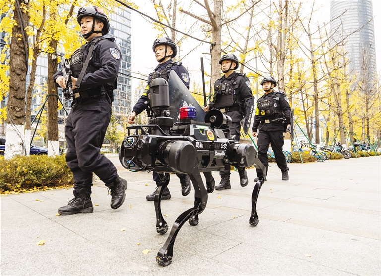 12月13日,成都市公安局高新分局巡逻大队警员和机器狗在街面巡逻。这批警用机器狗,单体重约50KG ,行动灵活,最快速度4米/秒。可实现奔跑、跳跃、自主避障、自动导航及自动充电等功能。该机器狗搭载了自主研发的机器人大脑,高度智能化,能够自主完成既定任务。 新华社发