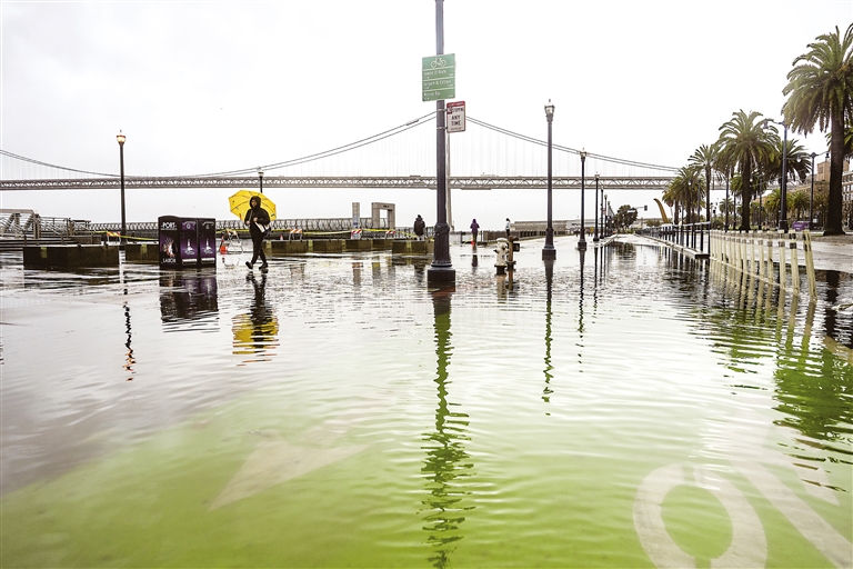 12月14日,在美国加利福尼亚州旧金山,海边的街道被积水淹没。据外媒报道,美国加利福尼亚州部分地区14日遭遇龙卷风袭击,强风暴雨致车辆、植被和电力设施受损。 新华社/美联