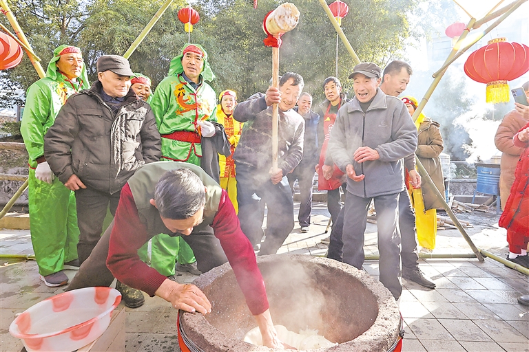 12月16日,德清县莫干山镇后坞村村民一起打年糕。当日,浙江省湖州市德清县莫干山镇后坞村举办第五届民俗集福节“年猪饭”活动,打年糕、舞龙灯、做圆子、制礼糕、看表演,村民们与前来观摩的游客一起感受乡村传统民俗年味,喜迎新年。新华社发