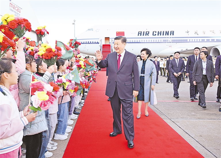 16时许,习近平乘坐的专机徐徐降落在澳门国际机场。习近平和夫人彭丽媛走出舱门,向欢迎人群挥手致意。澳门警察乐队奏响热情洋溢的欢迎曲,舞龙舞狮表演喜气欢腾。舷梯旁,两名少年儿童向习近平和彭丽媛献上鲜花。在澳门特别行政区行政长官贺一诚和夫人郑素贞陪同下,习近平和彭丽媛同前来迎接的人员亲切握手。数百名澳门青少年和各界群众代表挥动国旗、特别行政区区旗和鲜花,表达热烈的欢迎。