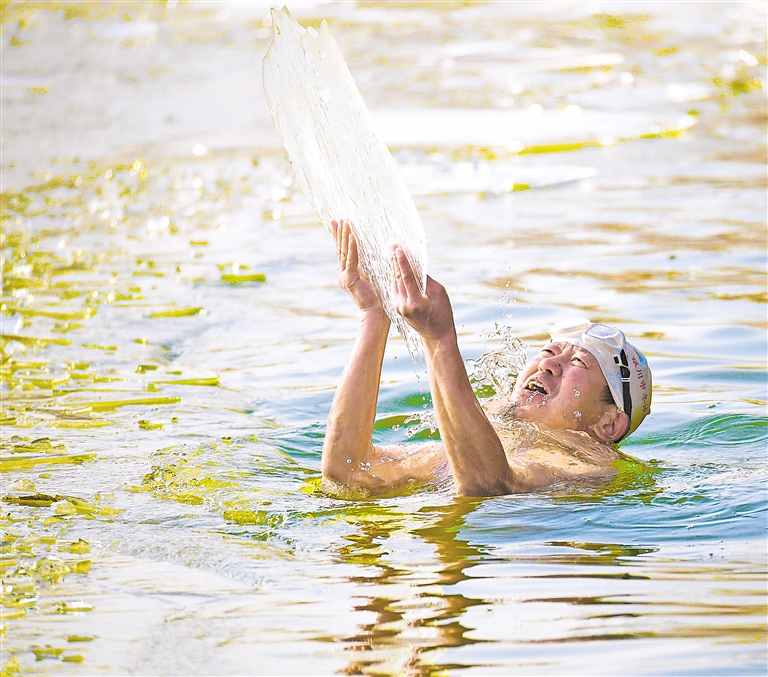一名冬泳爱好者在水中托起冰块。 本报记者 马楠 王洋 摄