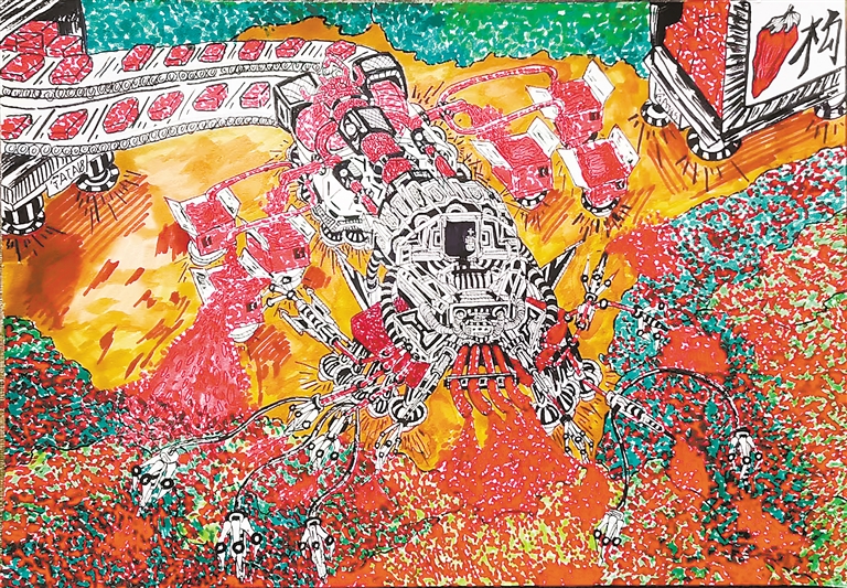 侯恩宇画作《智能光合利用枸杞采摘机》。 (图片由中宁县教体局提供)