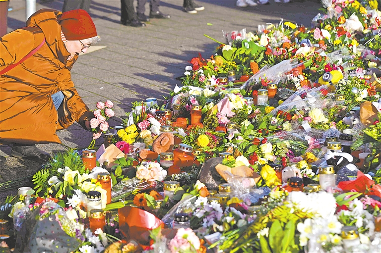 12月22日,在德国马格德堡,一名女子在遇袭圣诞市场附近的教堂前摆放鲜花。德国萨克森-安哈尔特州首府马格德堡一个圣诞市场20日晚发生车辆冲撞人群事件,造成至少5人死亡、200多人受伤,其中近40人伤势严重。 新华社/法新