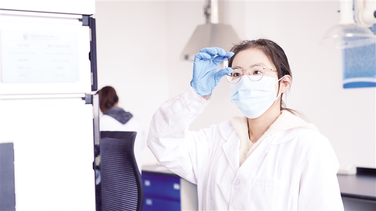 宁夏贝利特化学股份有限公司,产品研发人员在观察实验样品混合度。本报记者 李宏亮 摄