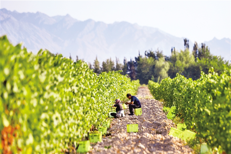 在贺兰山东麓,酿酒葡萄成熟的季节,工人们忙碌采摘。 本报记者 马楠 摄