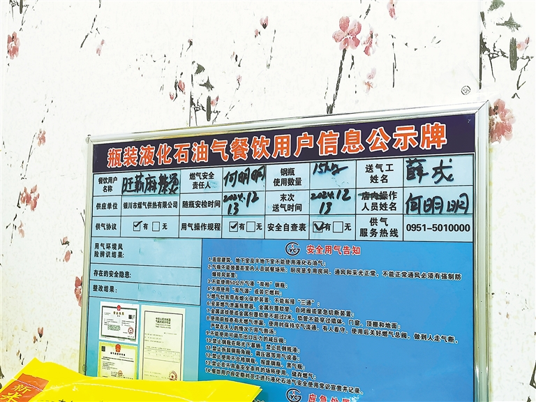 12月22日,银川市兴庆区新华路一家餐饮店,墙上悬挂着公示牌,上面标有瓶装液化石油气使用数量、安检时间、供应单位等信息,同时还有“安全用气告知”。瓶装液化气安全,一直是群众最为关切的,在餐饮店公示信息,不仅能提醒经营者安全用气,也会让市民时刻监督,预防事故的发生。 (本报记者 杨超 摄)