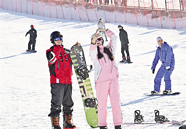 12月28日,冰雪爱好者在阅海滑雪场打卡留念。近日,银川市各滑雪场、景区纷纷开展冬季冰雪文旅、体育融合活动,群众对冰雪运动的热情逐渐升温。 本报记者 左鸣远 摄