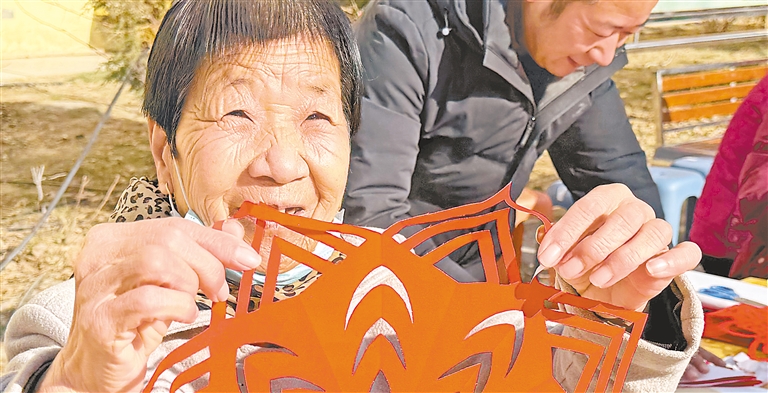 12月28日,中卫市沙坡头区滨河镇长安社区迎元旦活动现场,居民展示刚刚领到的窗花。 本报记者 王文革 摄