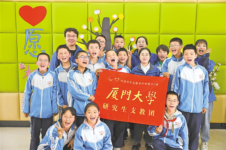 第二十五届闽宁协作厦门大学宁夏研究生支教团成员和孩子们在一起。 本报记者 王猛 李宏亮 摄
