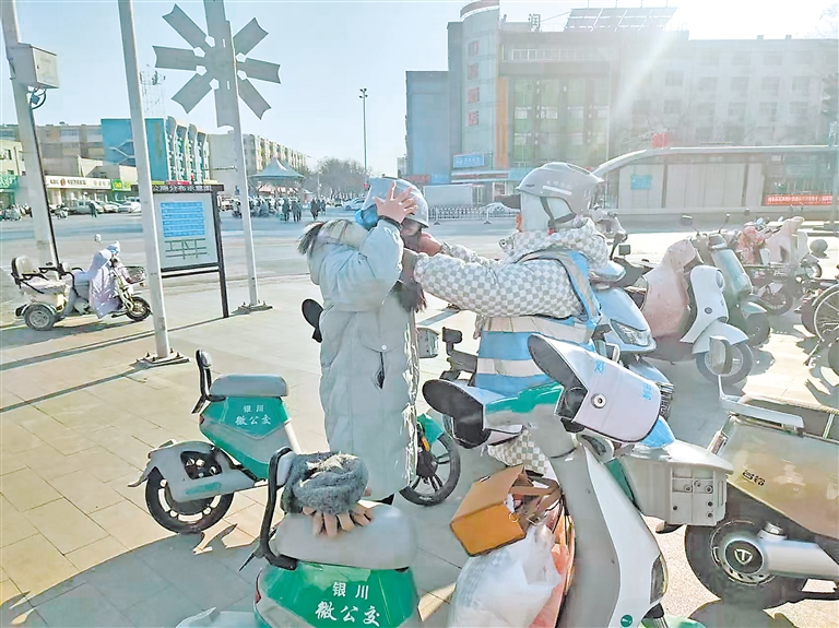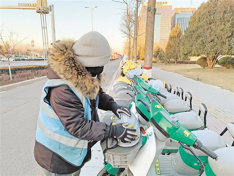 2024年12月27日17时许,银川公交“微公交”巡检人员闵燕荣在宁夏图书馆附近擦拭路面上摆放的共享电动自行车。她用干净潮湿的布子擦拭头盔内外,这些程序进行完毕后,再用酒精对头盔内外、车筐内全面消毒。