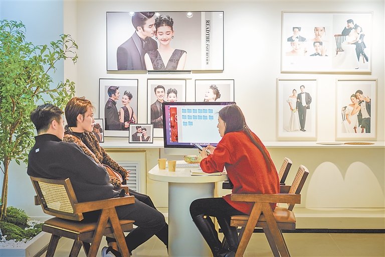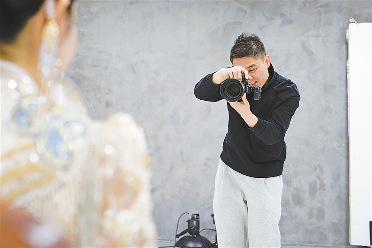 “笑一笑,杨先生离自己的女朋友近一些。”随着任进忠不断按下快门,一个个甜蜜的瞬间被定格。来拍结婚照的两位新人在任进忠的指导下愈发自然。