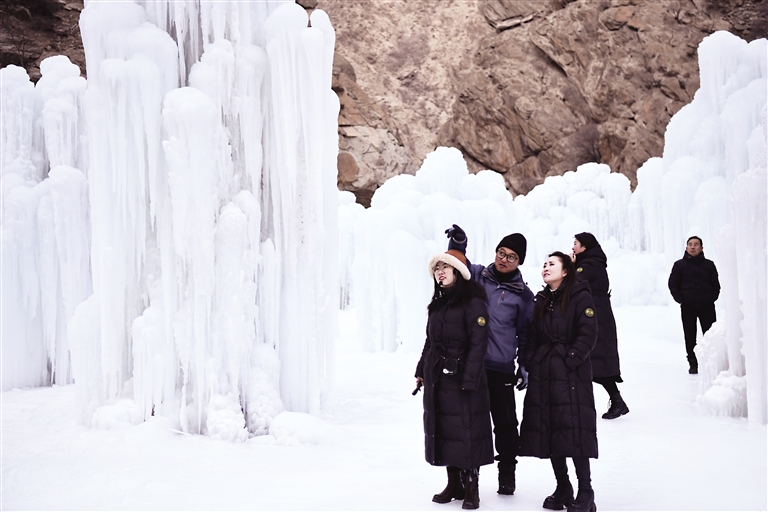 1月3日,游客在贺兰山岩画景区观赏冰瀑。据介绍,今冬贺兰山岩画景区以“探寻千古历史、乐享冰雪盛宴”为主题,举办冰上趣味活动、非遗文化展示、冬季山货文创大集等,让游客体验不一样的冬游乐趣。 本报记者 王刚 摄