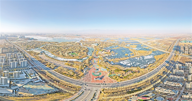 1月5日清晨,太阳斜照着位于银川市金凤区的中国花卉博览园,不远处冰封的阅海湖宛如一块镶嵌在大地上的宝石,冬日景色静谧如画。本报记者 马楠 摄